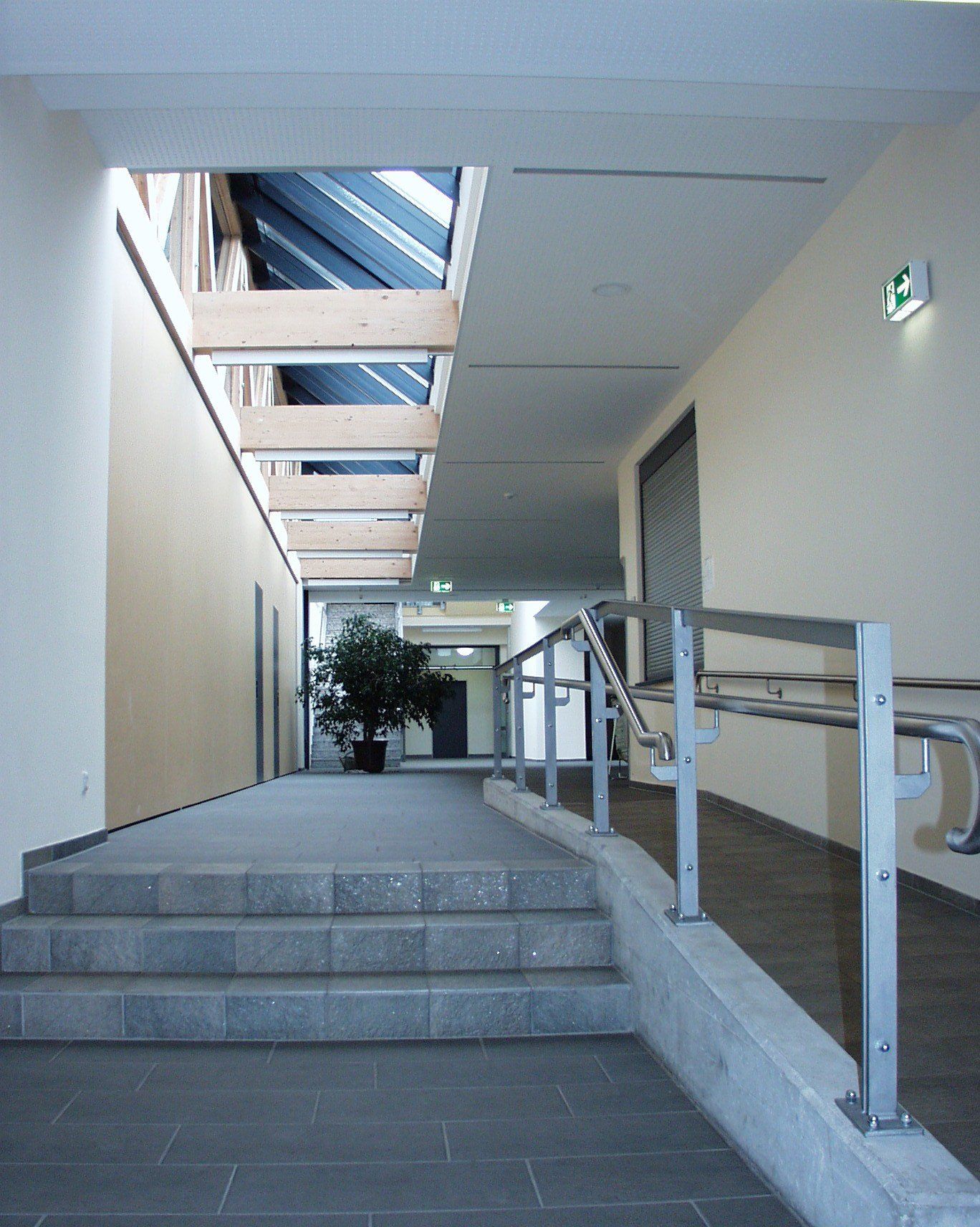 weitere Räumlichkeiten erforderlich, die in der Aufstockung des Klassentraktes geschaffen werden. Die Aufstockung greift die Materialität der letzten Erweiterungen auf. Damit sind die Neubauten deutlich ablesbar und fügen sich gleichzeitig mit dem Bestand zu einem stimmigen Gebäudeensemble.