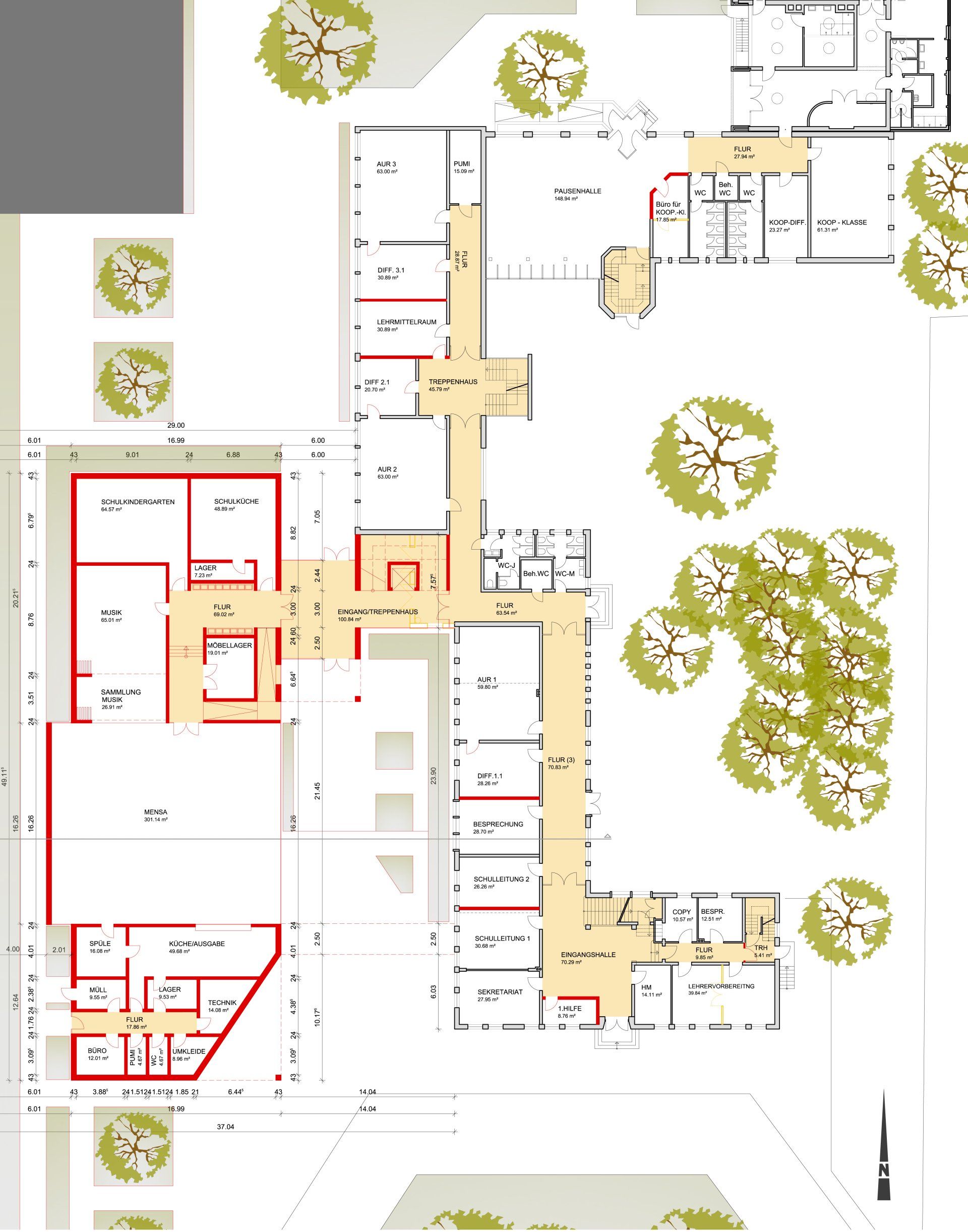 Im Erdgeschoss der Erweiterung werden Mensa, Fachräume und Schulkindergarten, im Obergeschoss Unterrichts- und Differenzierungsräume angeordnet. Im Dachgeschoss wird die vergrößerte Bibliothek untergebracht. Im Gebäudebestand werden zur Optimierung der funktionalen Zuordnungen Umbaumaßnahmen durchgeführt.