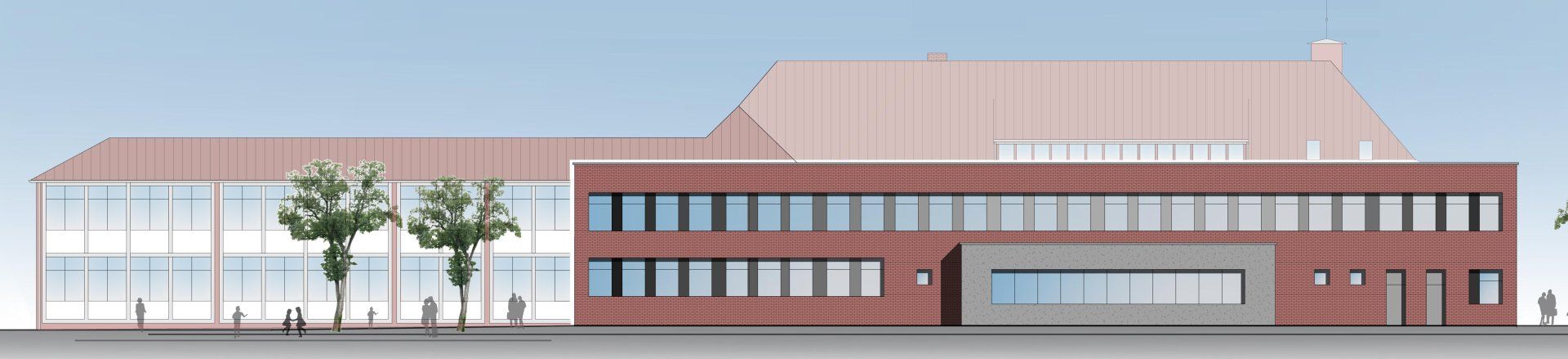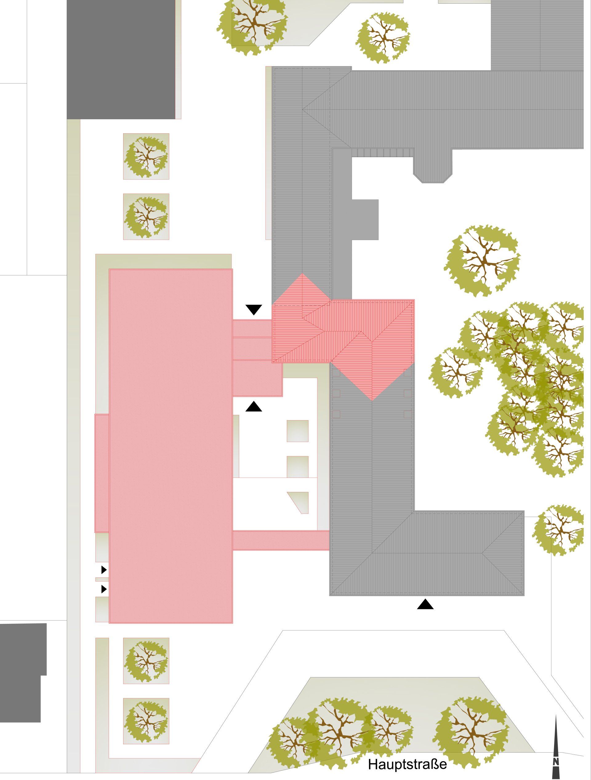 Daher wird parallel zum Hauptgebäude eine zweigeschossige Erweiterung platziert. Es entsteht ein Eingangshof mit zentral gelegenem Haupteingang und barrierefreier Erschließung aller Gebäudeteile. Mit neuem Treppenhaus und obergeschossiger Brückenanbindung an den Bestand entsteht ein effizientes Erschließungssystem, welches zugleich brandschutztechnische Mängel im Bestand behebt.