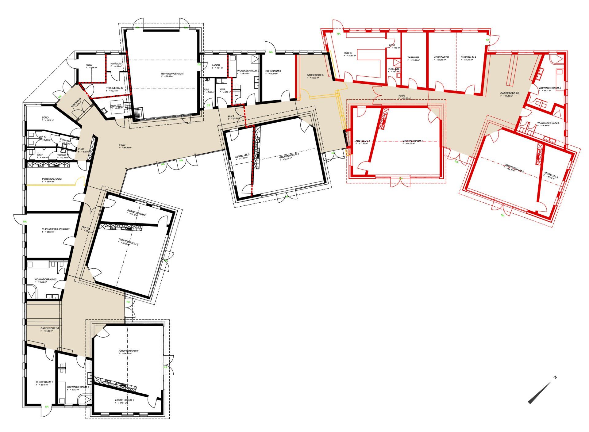 Aufgrund der großen Nachfrage nach Betreuungsmöglichkeiten im Krippenbereich wird der Neubau des 3-Gruppen-Kindergartens in einem 2. Bauabschnitt um 2 Gruppenräume mit Nebenraumprogramm und Küche ergänzt.