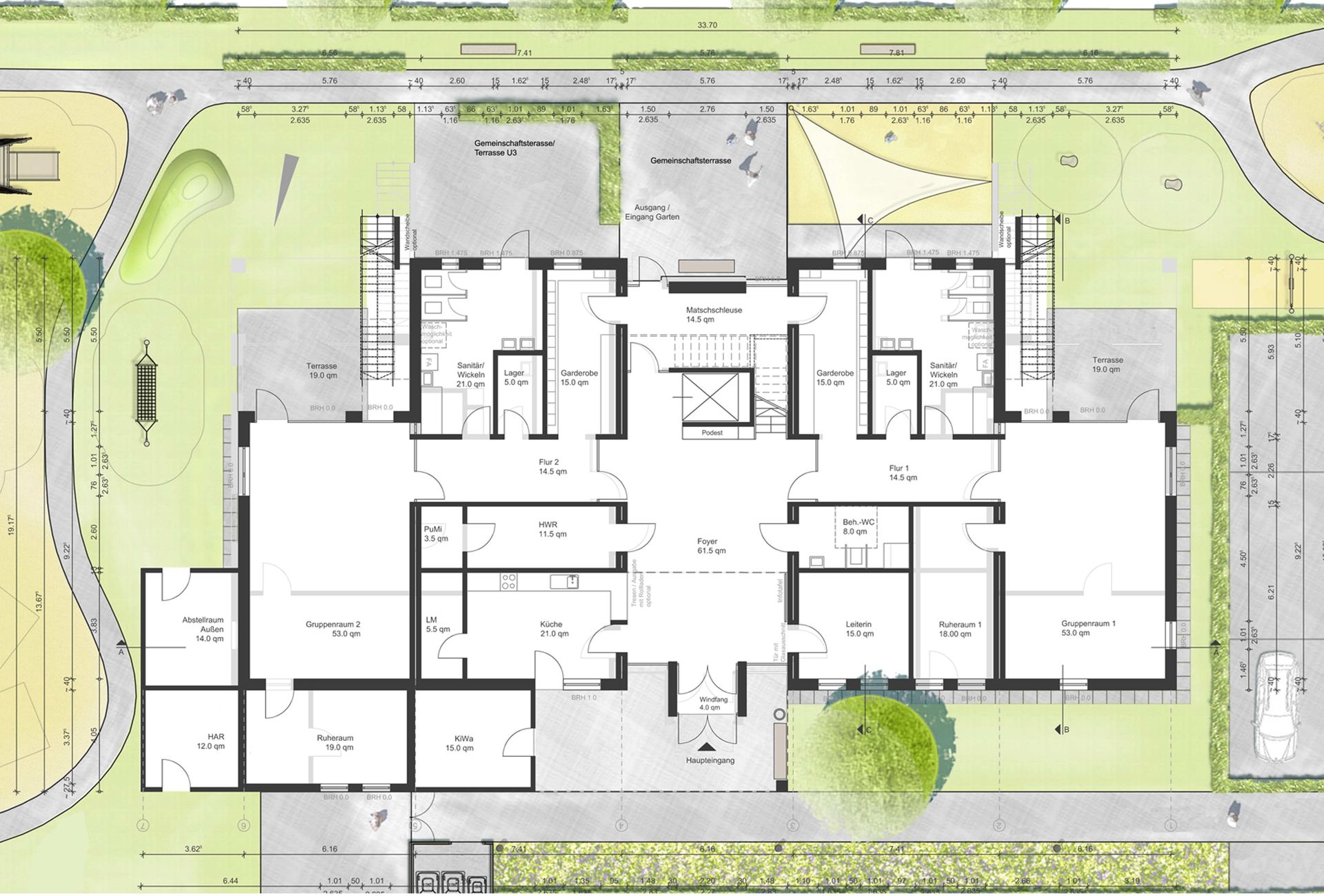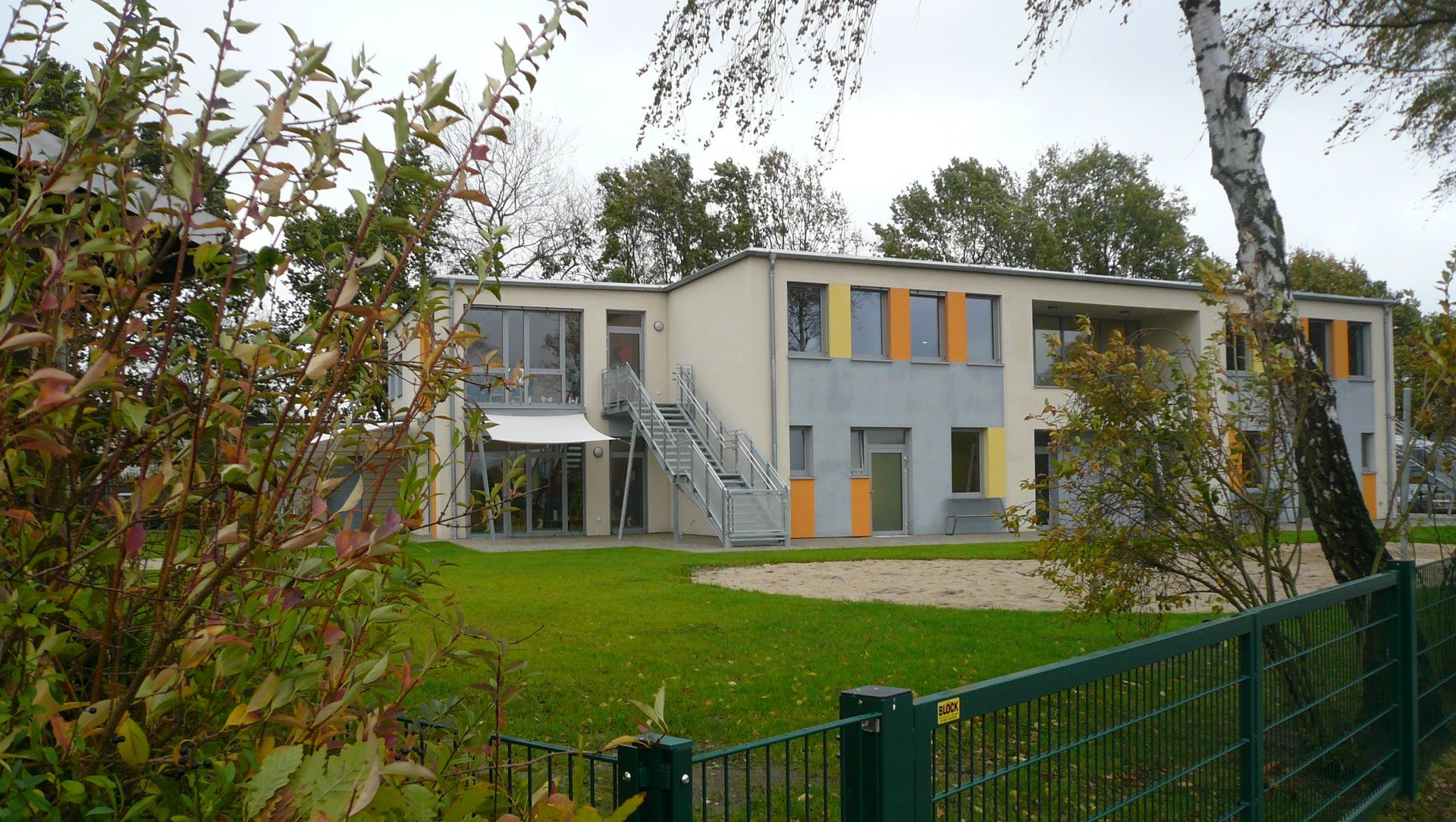 Beide Kindertagesstätten nehmen jeweils im Erdgeschoss zwei Krippengruppen und übergeordnete Räume, im Obergeschoss Kindergartengruppe, Mehrzweckraum und Nebenräume auf. Die Grundrisse sind unter den Gesichtspunkten Funktionalität, Orientierung und Außenbezug entwickelt und schaffen eine im positiven Sinne einfache Gebäudekubatur. Die lebendige Fassadengestaltung mit im wesentlich zwei Materialien, Farbakzenten und verschiedenen Fensterformaten erzeugt eine Vielfalt und Lebendigkeit, die der Nutzung als Kindertagesstätte entspricht.