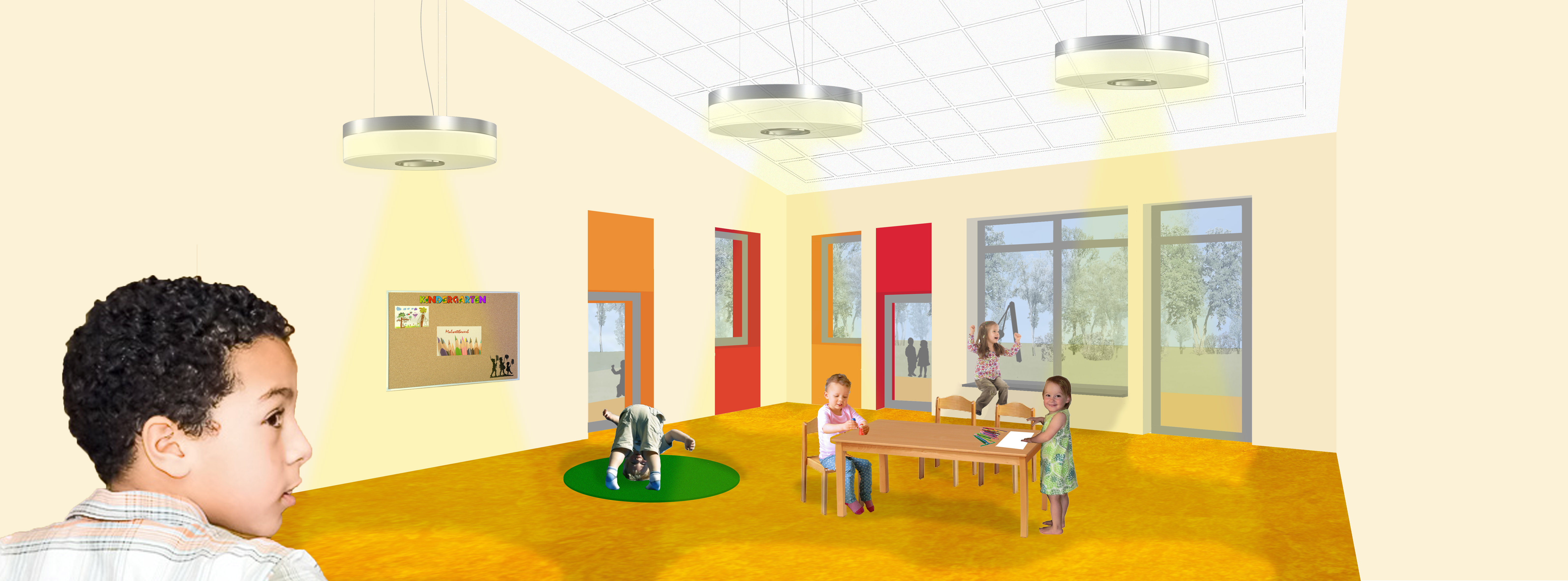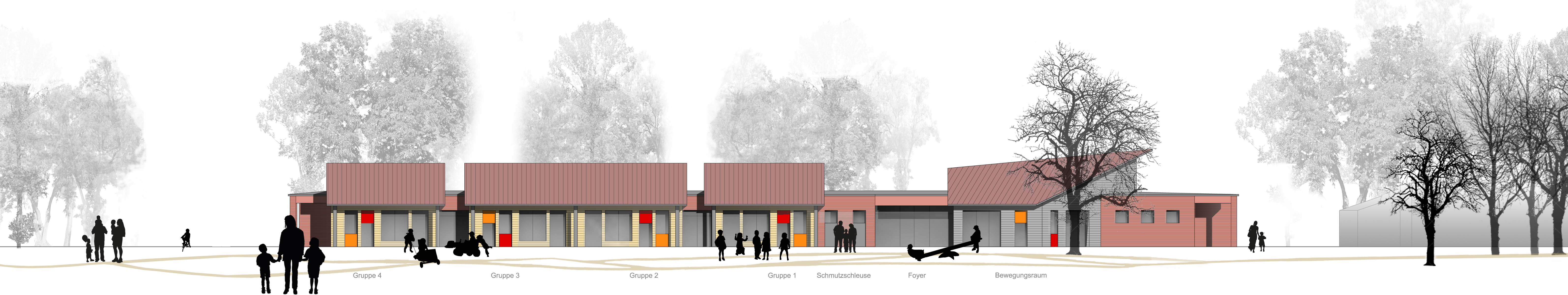 Nach Süden zum Freiraum werden Gruppen- und Mehrzweckräume in 4 durch geneigte Pultdächer ablesbare Baukörper entlang des Gebäuderiegels platziert, die durch ihre Anordnung differenzierte Außenbereiche ermöglichen.