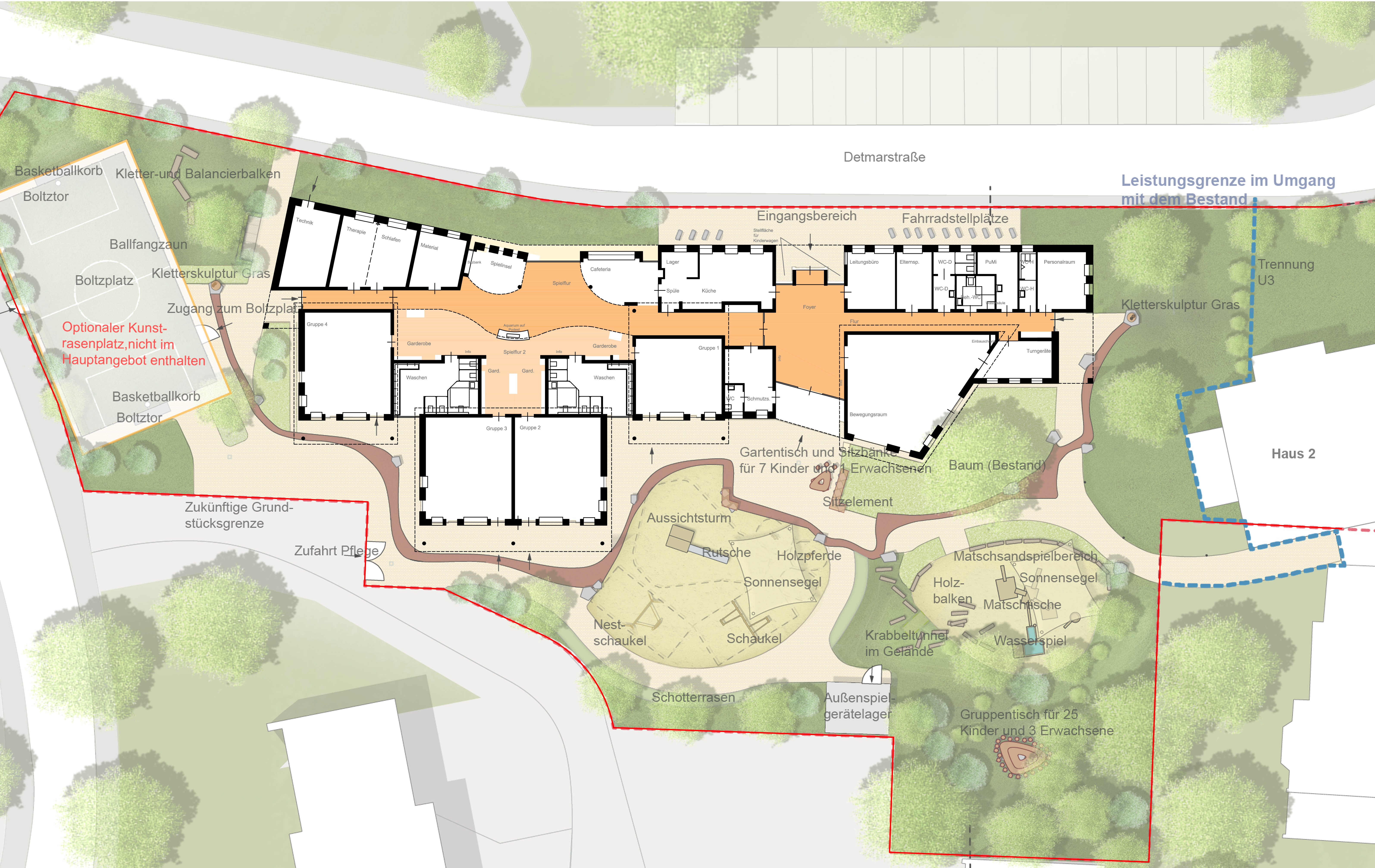 Durch die Längsausrichtung des Grundstückes er gibt sich für die Kindertagestätte eine langgestreckte Gebäudeform. Der nach Norden gelegenen Gebäuderiegel bildet mit einer Gesamtlänge von 60m und einer dem Straßenverlauf folgenden Form das Rückrat.
